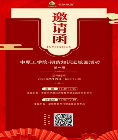 为落实证监会与教育部联合发布的《关于加强证券期货知识普及教育的合作备忘录》部署,做好期货知识普及工作,jinnianhui今年会金融学系与金瑞期货将在今年会连续第二年联合举办“期货知识进校园”活动暨第六届“郑商所杯”全国大学生金融模拟交易大赛宣讲。活动期间,金融学系教师及金瑞期货分析师将为今年会师生提供一系列免费培训,培训将围绕“郑商所杯” 报名方法、 软件下载及使用方法、比赛规则及评分指标、期货市场发展状况、相关法律法规及交易规则、商品期货套期保值案例,期货交易风险揭示、 风险识别及自我保护等方面展开。第一次培训将于2023年9月19日16:30——17:30通过百家云云端课堂线上进行(扫码即可观看)。