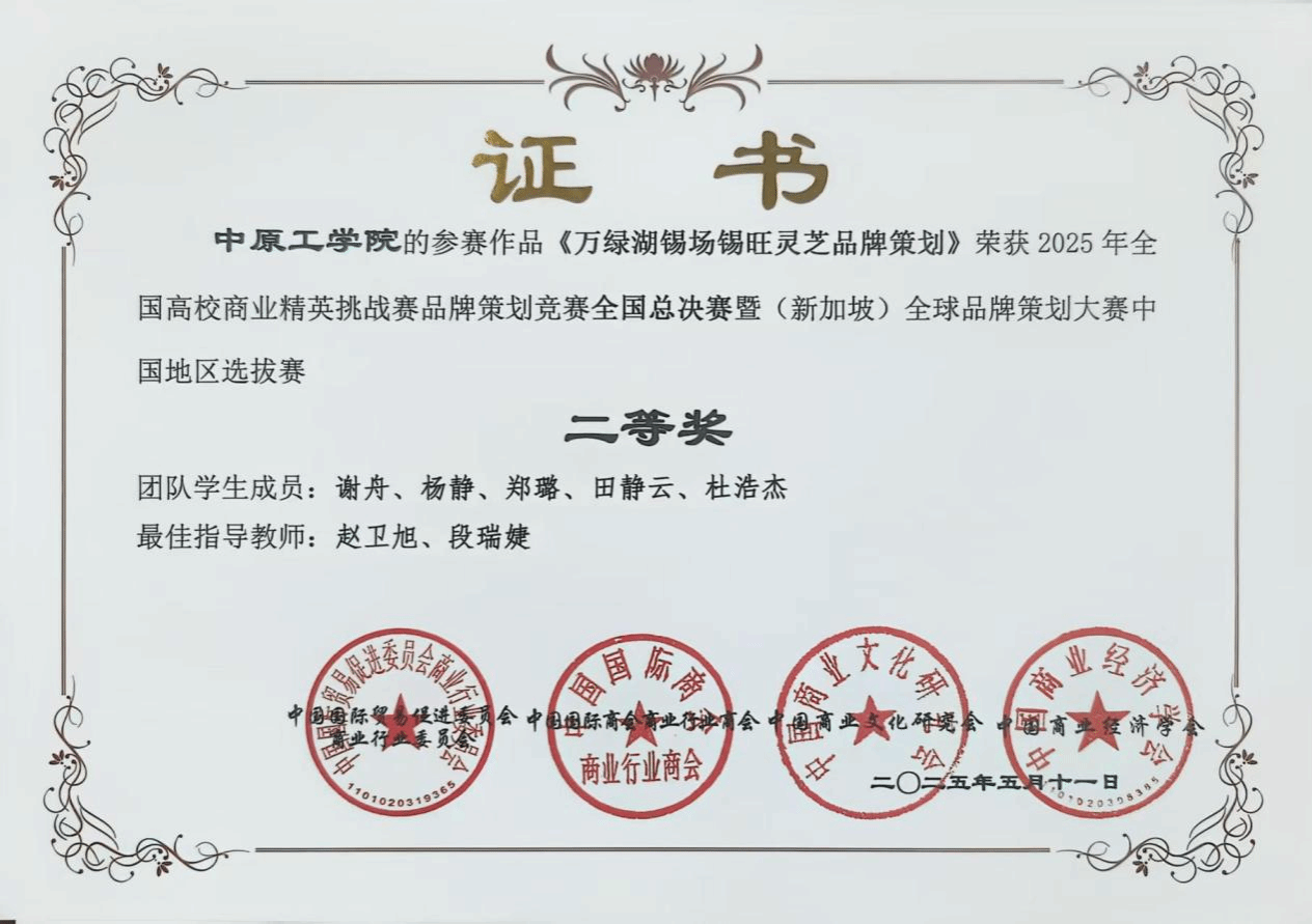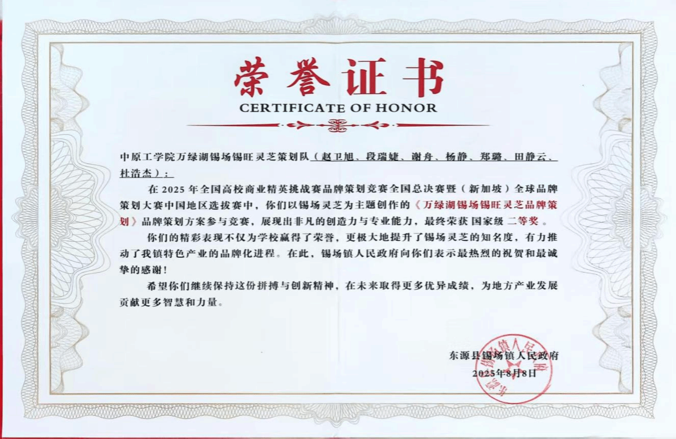 近日,2025年全国高校商业精英挑战赛品牌策划竞赛全国总决赛暨(新加坡)全球品牌策划大赛中国地区选拔赛落幕,今年会赵卫旭、段瑞捷两位老师带领学生团队(谢舟、杨静、郑璐、田静云、杜浩杰),为广东省河源市锡场锡旺农业发展有限公司量身打造的《万绿湖锡场锡旺灵芝品牌策划》方案,凭借创新实践价值斩获全国二等奖,东源县锡场镇人民政府同步为团队颁发荣誉证书,表彰该团队对当地灵芝产业品牌化发展的突出贡献。