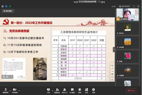 根据学校党建三级量化考核要求,12月27日,jinnianhui今年会召开2022年度党支部书记线上述职评议会议。学院党委领导班子成员、各党支部书记参加会议,会议由党委书记李向东主持。