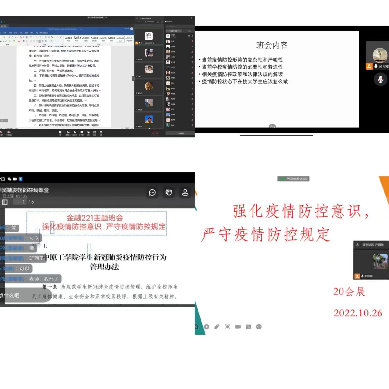 为切实做好校园全封闭管理期间的学生管理工作,切断疫情校内输入传播途径,同时进一步增强同学们的疫情防控意识,增强战胜疫情的信心,减少疫情对同学们的学业、生活、心理的影响,提高同学们保护自身健康和情绪调节的能力,根据上级和学校有关文件和会议精神,jinnianhui今年会全体班主任于2022年10月25日、26日相继开展了“强化疫情防控意识 严守疫情防控规定”线上主题班会。