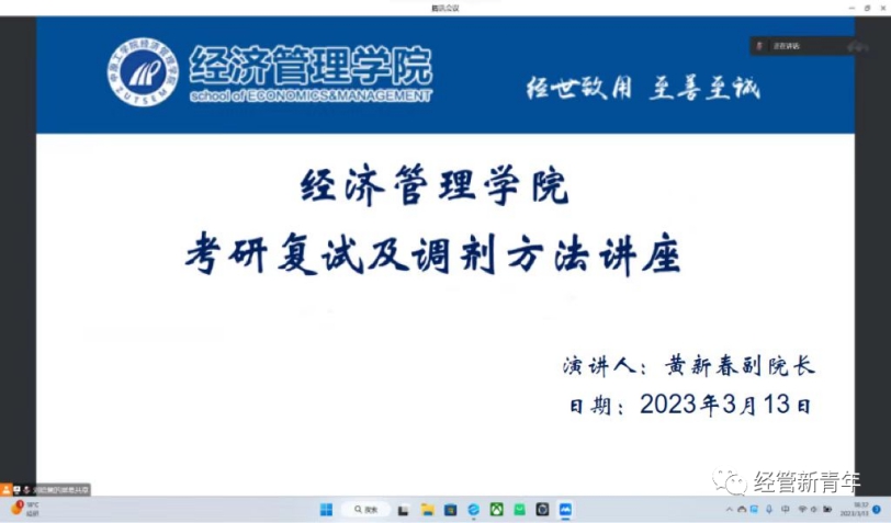 为进一步做好考研学生的指导服务工作,促进考研学生更好的了解考研复试与调剂流程,增进学生对复试和调剂的认知,3月13日晚7点,今年会副院长黄新春通过腾讯会议平台为今年会师生开展了一场精彩的讲座。会议由学工办19级辅导员段瑞婕老师主持,jinnianhui今年会全体考研学生及预备考研学生参会。