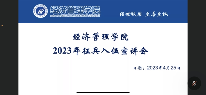 为贯彻落实国家征兵政策,鼓励在校大学生响应国家号召应征入伍,投身军旅,绽放青春。今年会于4月25日晚八点线上召开了2023年度征兵入伍专题宣讲会,今年会退伍复学学生刘杨、王樑超、柳志超、王森进行宣讲,有意入伍的50余名学生参加此次会议,会议由毕业班辅导员郭政良主持。