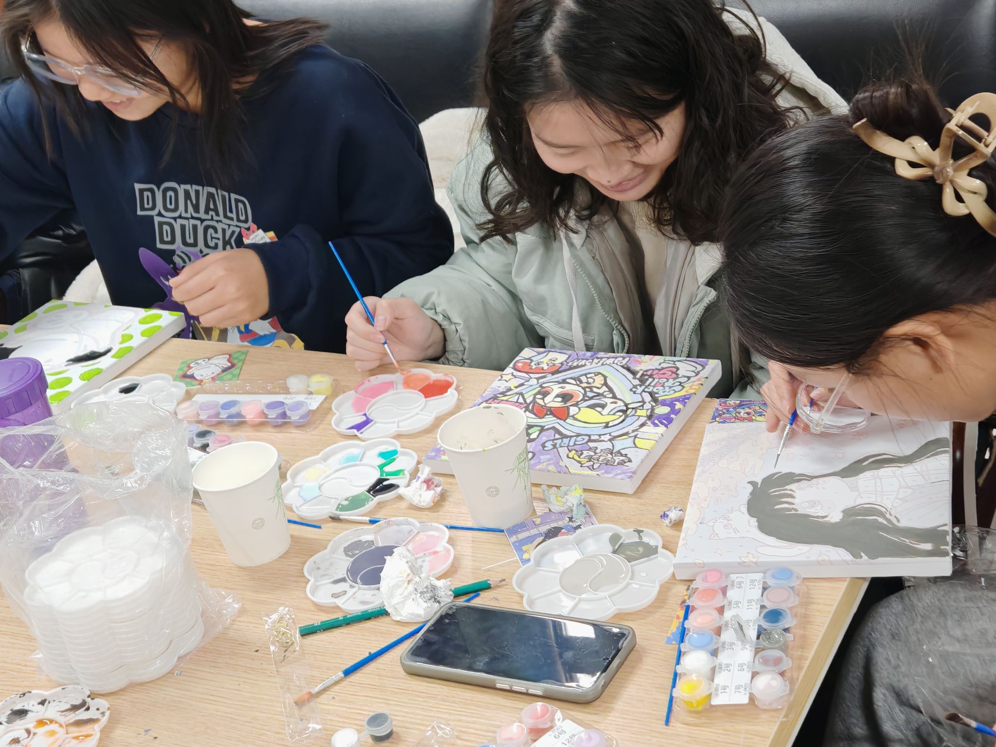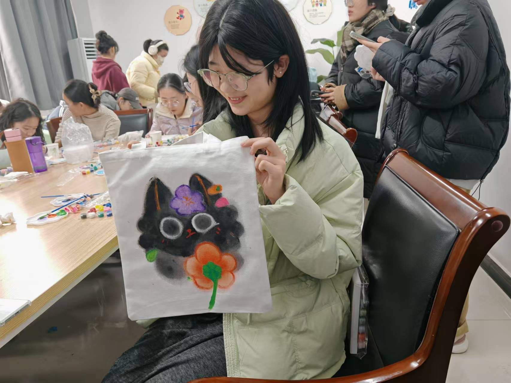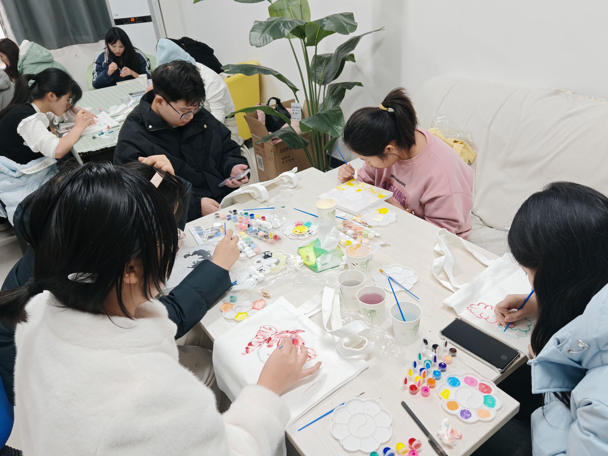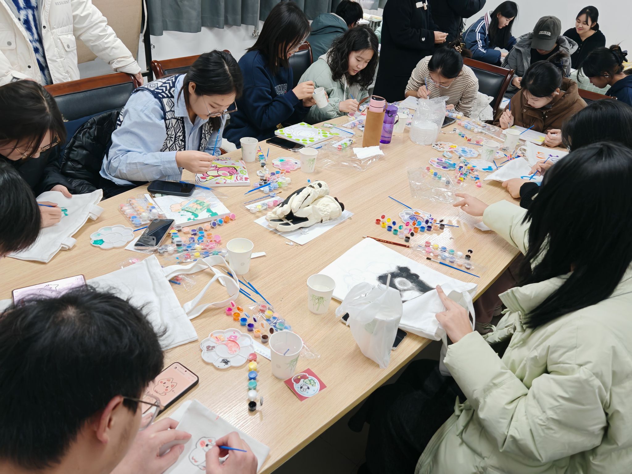 活动现场气氛活跃而不失温馨。桌子上摆放着五颜六色的颜料、画笔、帆布袋、数字油画画板。在手绘帆布袋区域,同学们充分发挥自己的想象力。有的同学在帆布袋上精心绘制了自己喜爱的卡通角色,可爱俏皮栩栩如生,有的同学在帆布袋上写下激励自己的话语,简洁明了却充满力量。把脑海中的画面呈现在帆布袋上,真可谓趣味十足又收获满满。