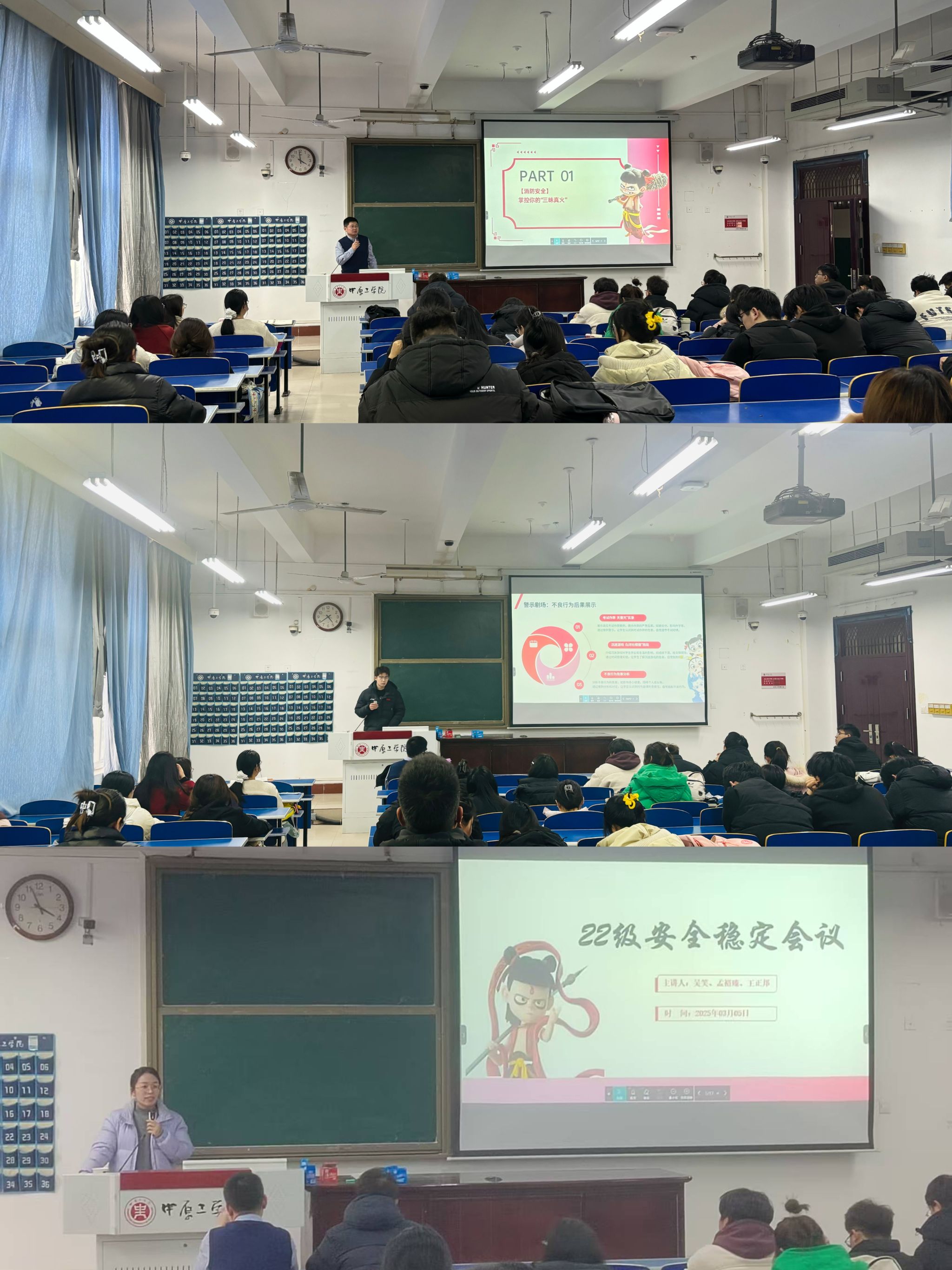 22级的安全稳定会议,3月5日在3号教学楼237教室热烈召开,辅导员吴笑、孟裕臻以消防安全、财务安全、政治安全及学业规划为核心议题,通过生动案例与深刻剖析,为学生们上了一堂生动的安全教育课,为新学期的平稳开局奠定了坚实基础。