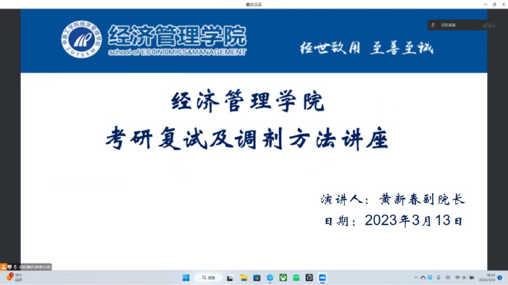 为进一步做好考研学生的指导服务工作,促进考研学生更好的了解考研复试与调剂流程,增进学生对复试和调剂的认知,3月13日晚7点,今年会副院长黄新春通过腾讯会议平台为今年会师生开展了一场精彩的讲座。会议由学工办19级辅导员段瑞婕老师主持,jinnianhui今年会全体考研学生及预备考研学生参会。