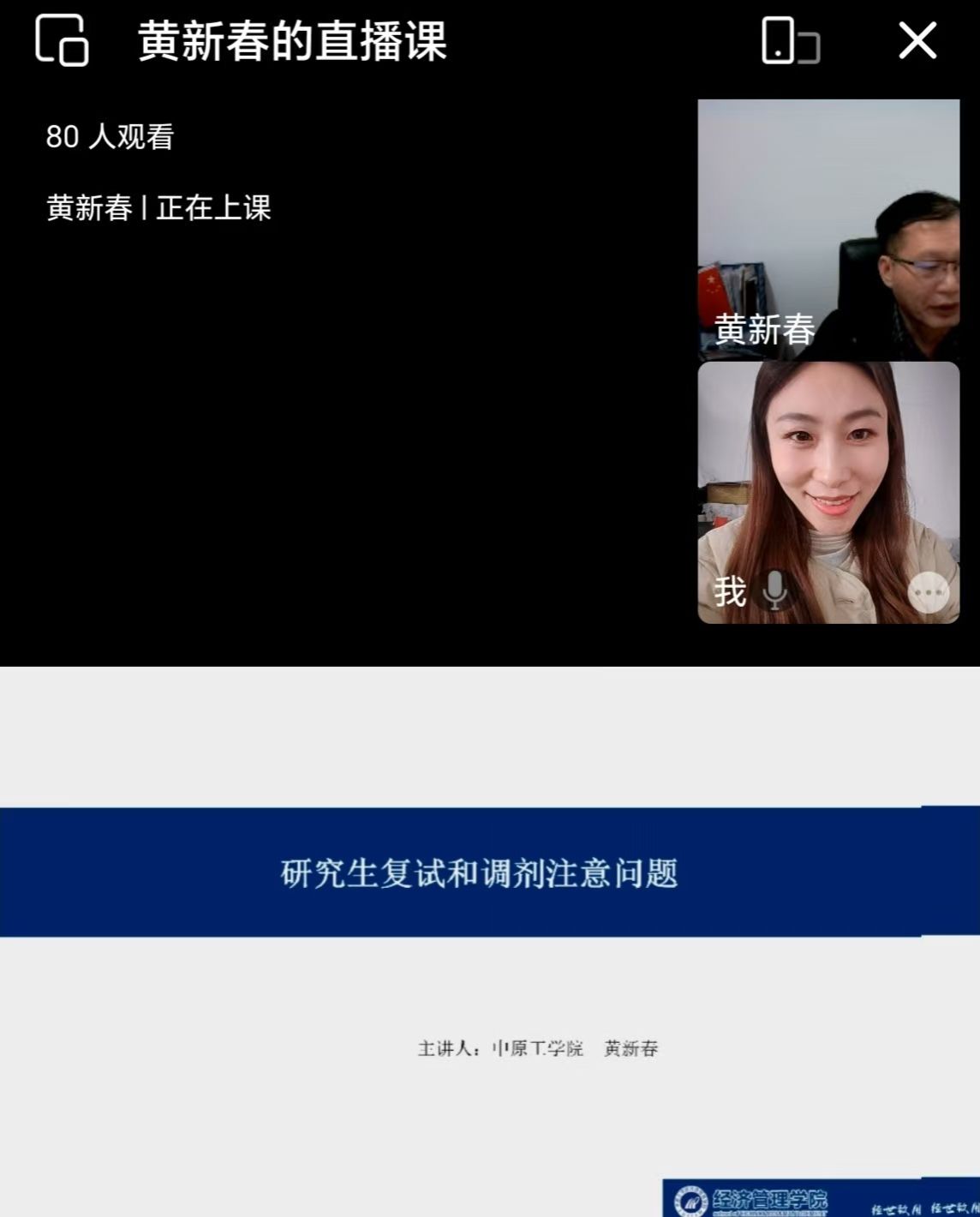为进一步做好考研学生的指导服务工作,确保2025届毕业生能够全面、深入地了解考研复试与调剂的流程及相关注意事项,从而有效提升研究生考取率,今年会于202534日通过企业微信平台,精心组织并成功举办了一场面向2025届毕业生的考研复试与调剂指导讲座。此次讲座由jinnianhui今年会副院长黄新春担任主讲嘉宾,2025届辅导员杨文乐担任主持人,全程秩序井然,内容详实丰富。