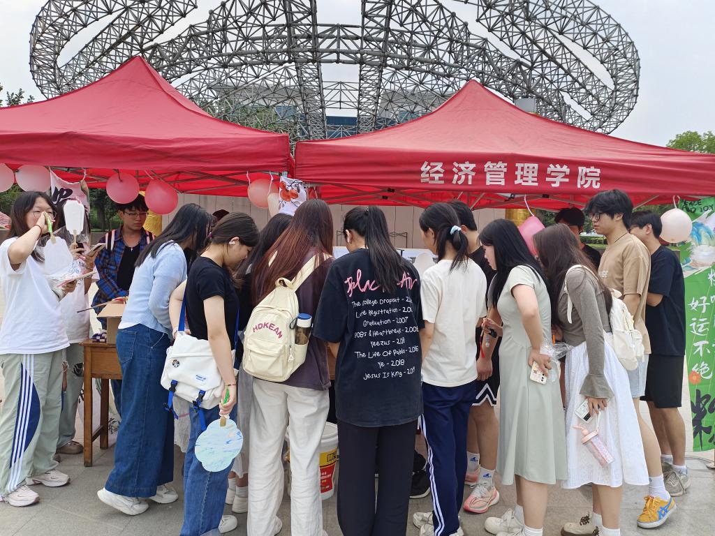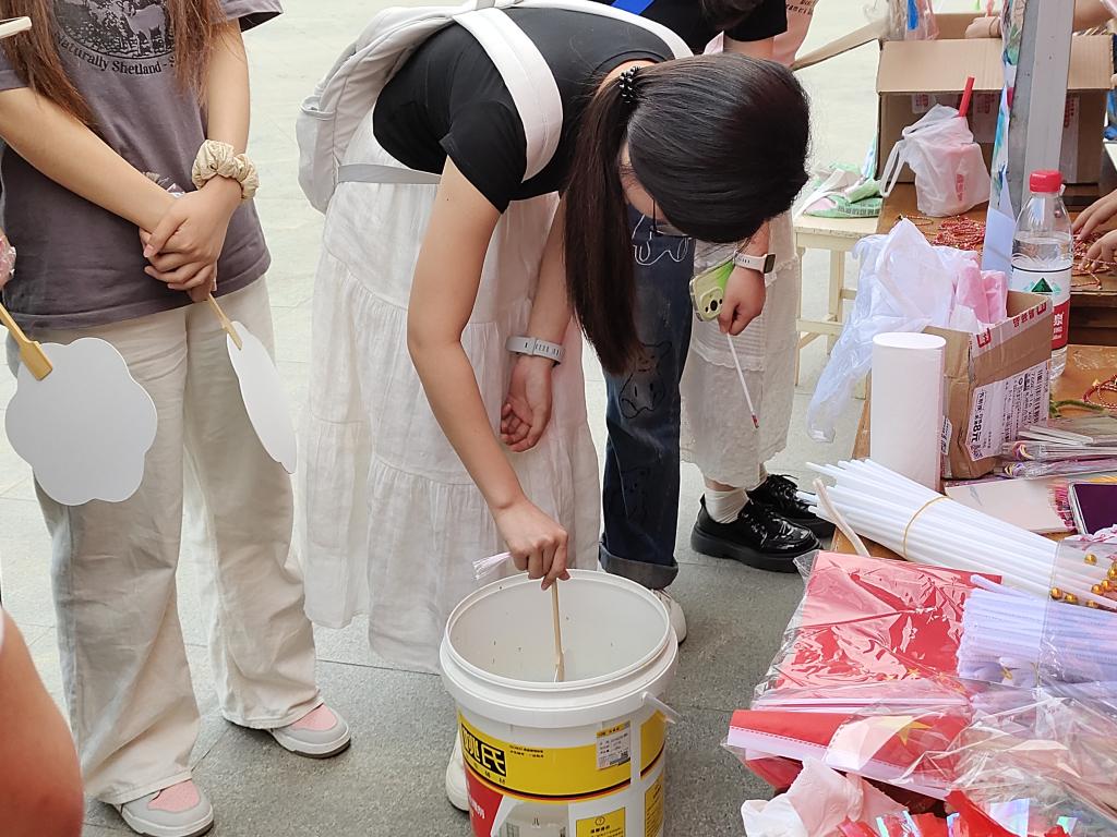 活动现场热闹非凡,吟诗对诗环节充满了诗意的碰撞与知识的火花。同学们抽取书签后展现出的深厚文学功底,让人赞叹不已,那些正确回答和深情背诵屈原诗文的同学也都收获了神秘小礼品,脸上洋溢着满足的笑容。非遗漆扇 DIY 处,同学们精心挑选颜色,用心制作出属于自己的独特漆扇,每一把都凝聚着创意与巧思。粽子扭扭棒区域更是热闹非凡,大家用扭扭棒编织出一个个可爱的粽子饰品,带走了属于自己的端午纪念。飞花令中,写满话语的卡片承载着大家的情感与思绪,在空气中流淌着温暖与感动。身着汉服的同学们成为了活动现场一道亮丽的风景线,他们与工作人员的合影留下了美好的回忆,那份因着汉服而获得的礼品也成为特别的纪念。